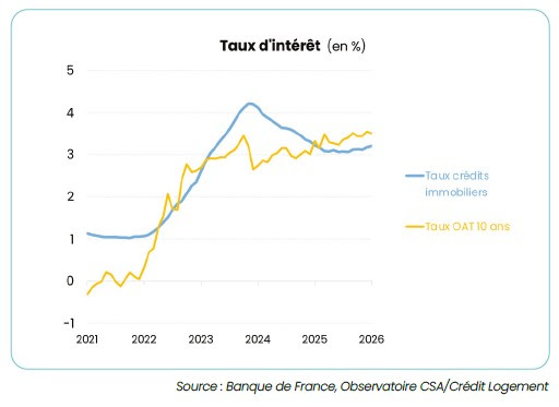 Depuis, les taux repartent très légèrement à la hausse et atteignent 3,20 % en janvier 2026, selon l’Observatoire CSA/Crédit Logement. Fait notable, ils se situent désormais en dessous des taux des obligations d’État à dix ans, dans un contexte de concurrence entre les banques pour attirer de nouveaux clients, et de méfiance accrue des investisseurs vis-à-vis de la dette publique française. Les banques, financées principalement par les dépôts et les ressources de la BCE, peuvent proposer aux ménages des conditions de crédit plus favorables que celles auxquelles l’État emprunte sur les marchés.