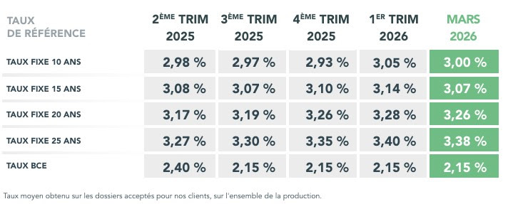 - En mars 2026, les taux moyens des crédits immobiliers atteignent 3,07 % sur 15 ans, 3,26 % sur 20 ans et 3,38 % sur 25 ans, en légère baisse.