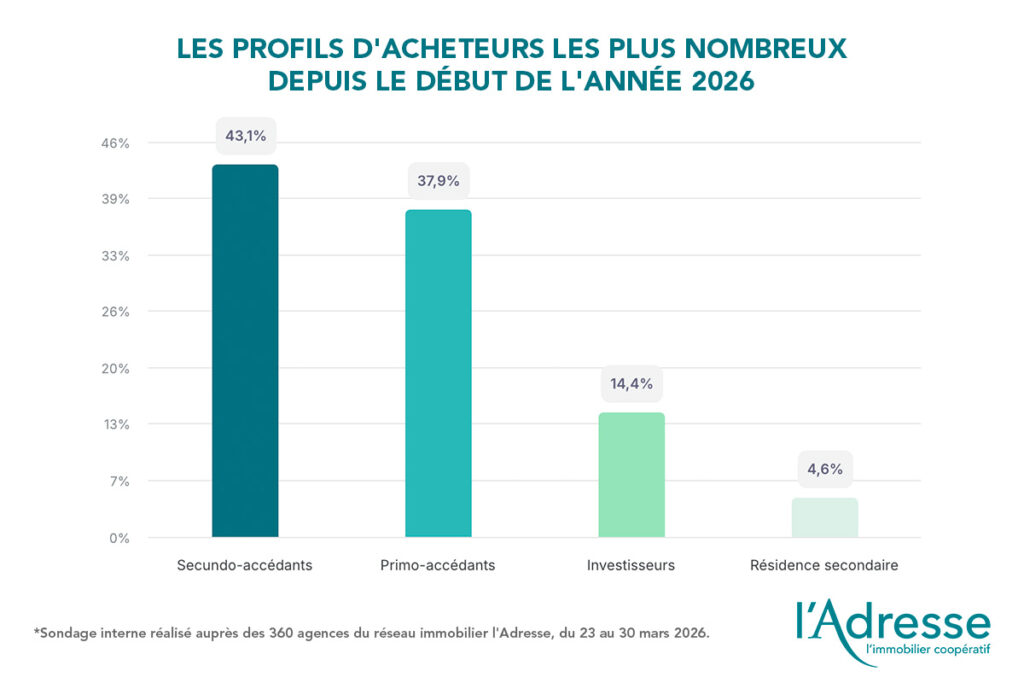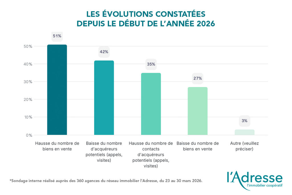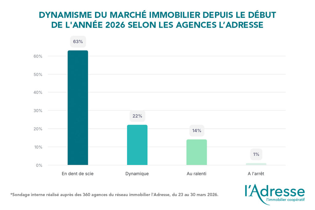 Le réseau coopératif l’Adresse a réalisé, comme tous les trimestres, un sondage interne auprès de ses 360 agences entre le 23 et le 30 mars, pour dresser un bilan du marché immobilier du premier trimestre et dessiner les perspectives pour le reste de l’année 2026.
