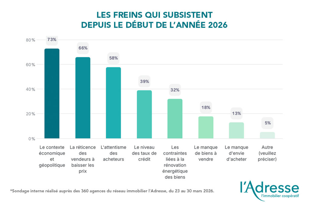 - Pour 2026, 52 % des agences l'Adresse anticipent un marché comparable à 2025, malgré les incertitudes liées au conflit en Iran et aux taux de crédit.