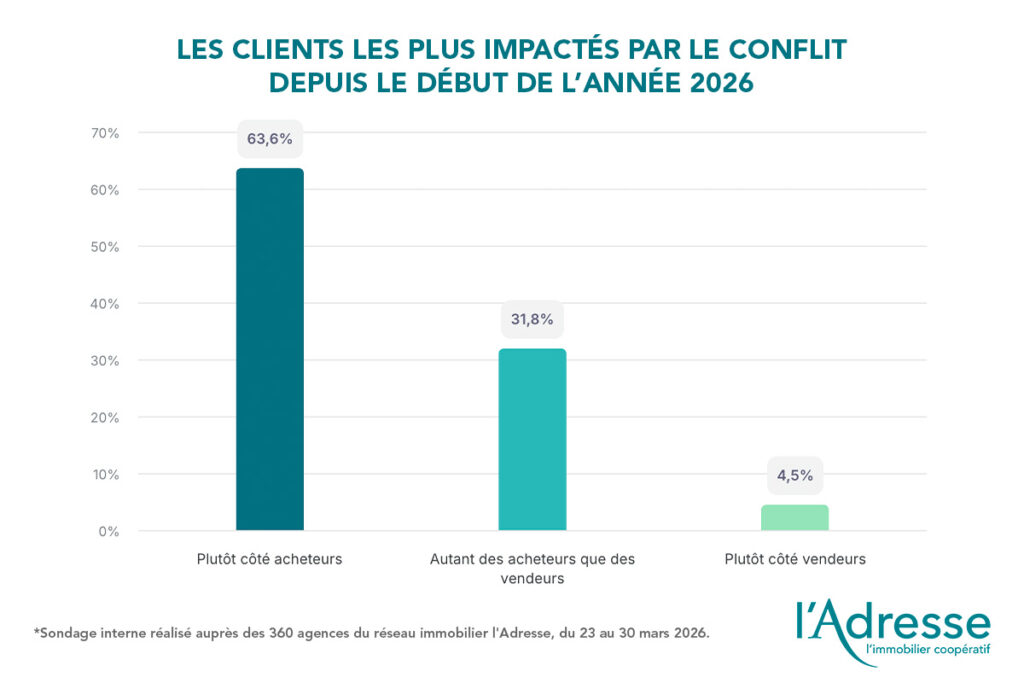 En effet, plus de 65 % des agences l’Adresse estiment que la guerre en Iran a impacté leur activité, avec des conséquences plus importantes côté acheteurs selon une majorité d’agences (65%), mais tout autant coté acheteurs que vendeurs, selon plus de 30 % d’entre elles. Notamment, ceux qui avaient le projet de vendre leur bien pour en acheter plus grand ou ailleurs, sont les plus frileux de réaliser cette double opération dans le contexte actuel.